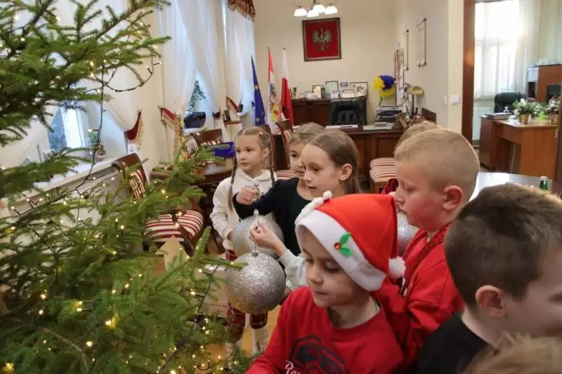 19.12.2022 r. uczniowie kl. I Szkoły Podstawowej im. Adama Mickiewicza w Udaninie, wspólnie z wychowawczynią Panią Mirosławą Babicką, pięknie przystroili pachnące drzewko. W urzędzie zrobiło się świątecznie, a to nie tylko zasługa pierwszaków! Podczas ubierania Koło Misyjne pod przewodnictwem Pani Violetty Leńskiej wprowadziło nas w magię Świąt Bożego Narodzenia śpiewając najpopularniejsze polskie kolędy.