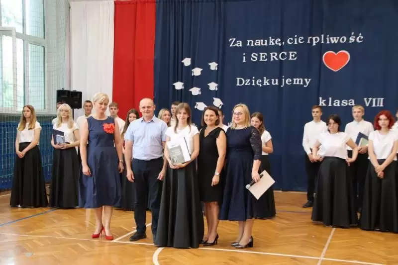 Kolejnym punktem uroczystego zakończenia roku były podziękowania i gratulacje w kierunku uczniów, rodziców i nauczycieli, które skierowała pani Dyrektor Joanna Dumicz, Wójt Gminy Udanin Wojciech Płaziuk oraz Przewodnicząca Rady Rodziców Jolanta Pawłowska. Uczniowie klas od VIII do I za bardzo dobre i celujące wyniki w nauce oraz wzorowe i bardzo dobre zachowanie otrzymali świadectwa z czerwonym paskiem oraz nagrody książkowe ufundowane przez Radę Rodziców.