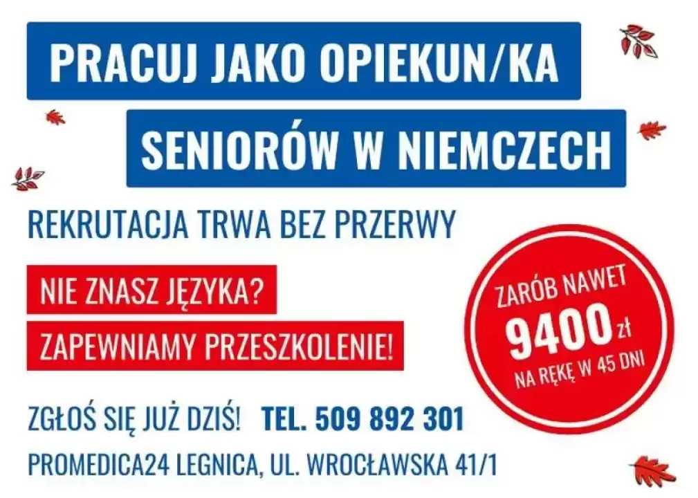 Straciłaś/eś pracę w związku z kryzysem? Posiadasz doświadczenie w opiece nad osobą starszą lub niesamodzielną, znasz język niemiecki przynajmniej w stopniu podstawowym lub jesteś gotowy/-a do jego nauki na jednym z naszych kursów? Zgłoś się do nas już dziś! Zarabiaj nawet 9400 zł na rękę w 45 dni!