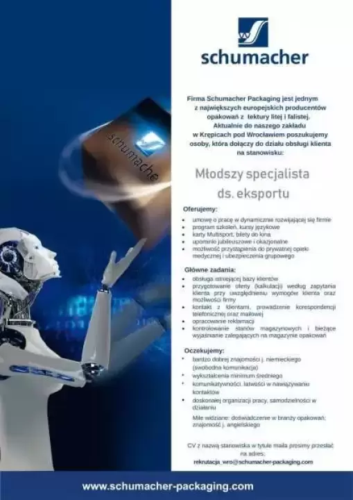 Firma Schumacher Packaging jest jednym z największych europejskich producentów opakowań z tektury litej i falistej. Aktualnie do naszego zakładu w Krępicach pod Wrocławiem poszukujemy osoby, która dołączy do działu obsługi klienta na stanowisku: Młodszy specjalista ds. eksportu