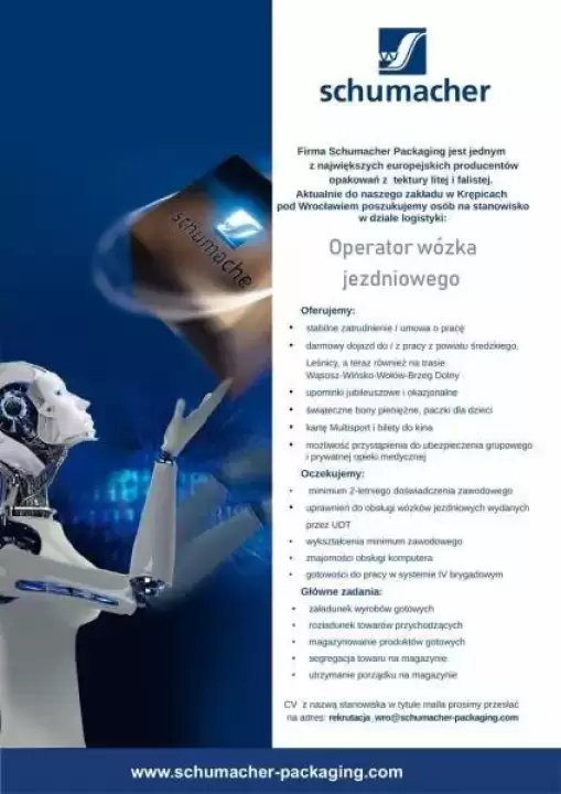 Firma Schumacher Packaging jest jednym z największych europejskich producentów opakowań z tektury litej i falistej. Aktualnie do naszego zakładu w Krępicach pod Wrocławiem poszukujemy osób na stanowisko w dziale logistyki: Operator wózka jezdniowego