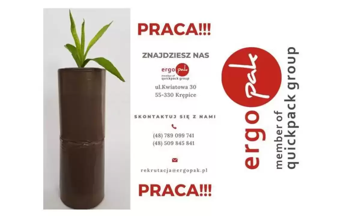 Jesteśmy firmą z 30-letnim doświadczeniem w produkcji opakowań z tworzyw sztucznych. Wskutek dynamicznego rozwoju, działamy w ramach Międzynarodowego Koncernu Produkcyjnego Quickpack GmbH. Do naszego zakładu mieszczącego się w Krępicach tuż pod Wrocławiem poszukujemy osób do pracy na stanowisko: