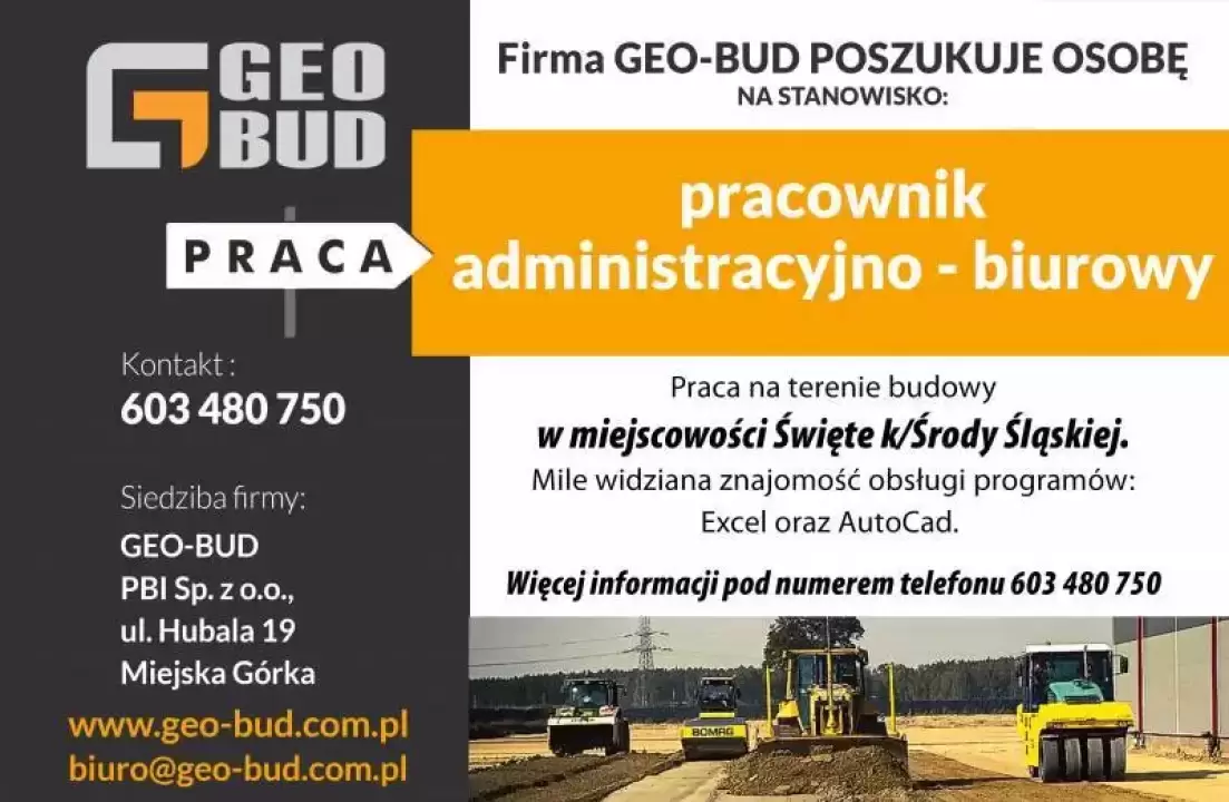 Firma Geo-Bud poszukuje osoby na stanowisko pracownika administracyjno - biurowego na terenie budowy w Świętem koło Środy Śląskiej.
