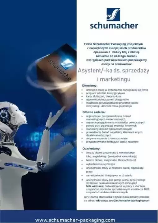 Firma Schumacher Packaging jest jednym z największych europejskich producentów opakowań z tektury litej i falistej. Aktualnie do naszego zakładu w Krępicach pod Wrocławiem poszukujemy osoby na stanowisko: Asystent/-ka ds. sprzedaży i marketingu.