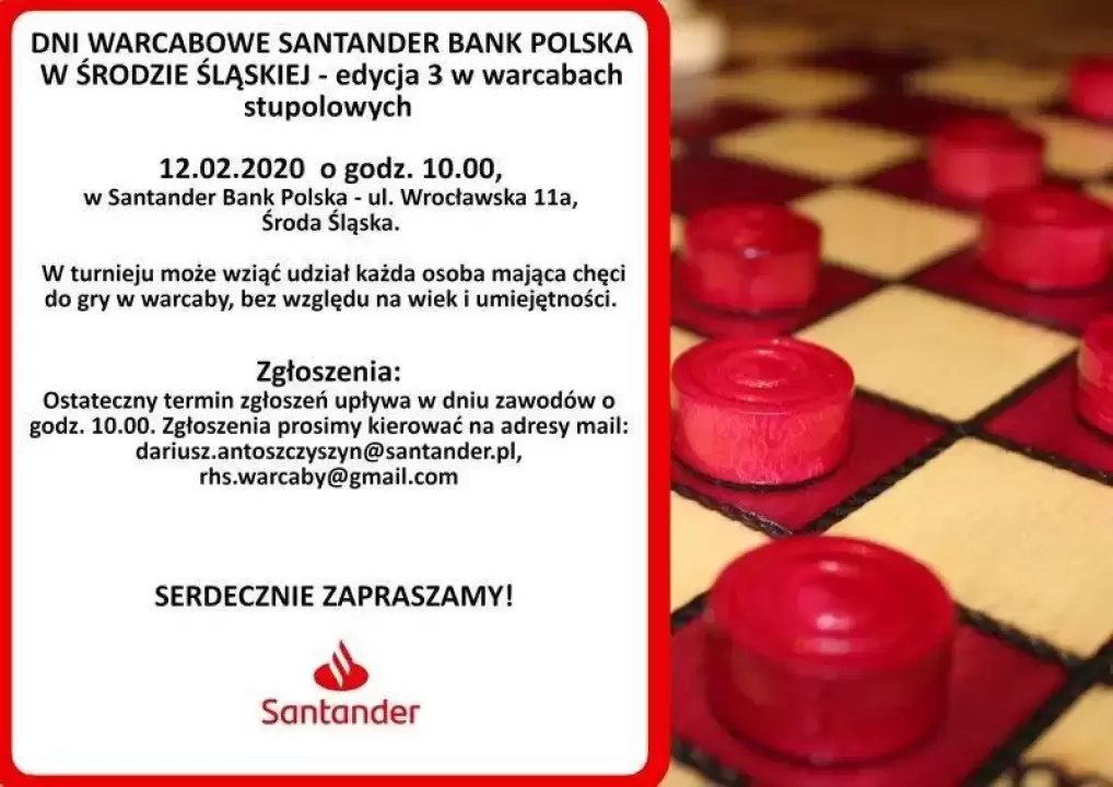 W imieniu organizatorów zapraszamy wszystkich chętnych do wzięcia udziału w 3 edycji Dni Warcabowych, które odbędą się 12 lutego br. w siedzibie Santander Bank Polska przy ul. Wrocławskiej 11a w Środzie Śląskiej.
