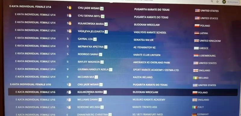 Bardzo udane starty zaliczyła także Maria Kułakowska, która wygrała kategorię U-14 e-kumite w Samurai Chalange. Zdobyła 3 medale w turnieju Adidas World Open Series#4, dwa srebrne w e-kata w U-16 oraz w U-14 e-kumite i brązowy e-kata w U-14 .Marysia startowała również w Golden League Karate w kategorii e-kata U-16, gdzie zajęła 2. miejsce.