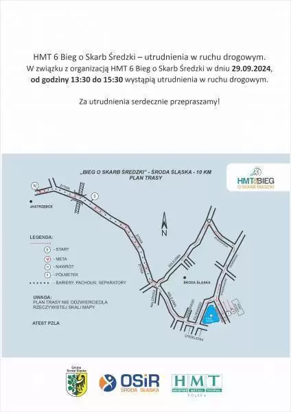 - dystans HMT VI Biegu o Skarb Średzki wynosi 10 km (1 pętla), trasa posiada atestację PZLA,
