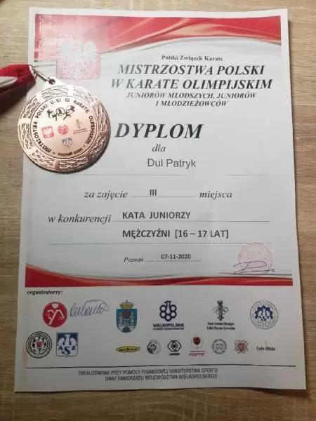 W Poznaniu 07.11.2020 r. odbyły się Mistrzostwa Polski w Karate Olimpijskim Juniorów Młodszych, Juniorów i Młodzieżowców. Bardzo dobrze wypadli w nich Patryk Dul, który wywalczył brązowy medal w kata juniorów. Medal tego samego koloru zdobył także Bartłomiej Babiński w kata młodzieżowców.