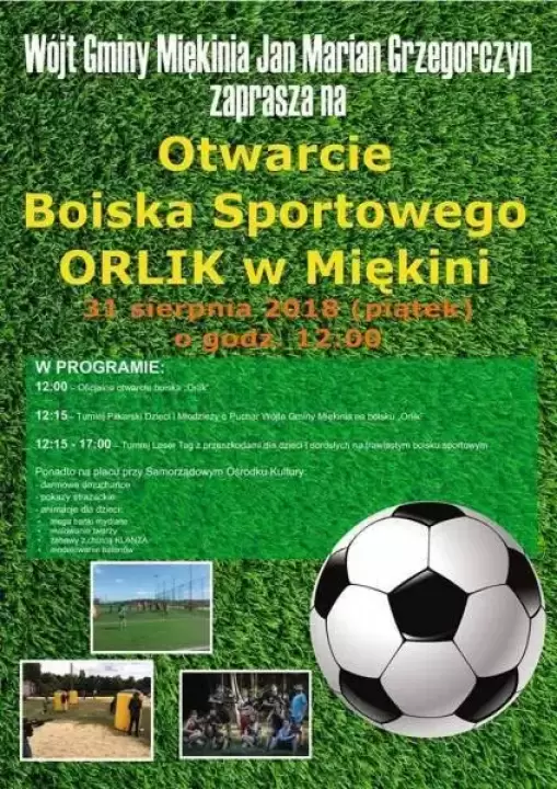 O godzinie 12:00 nastąpi uroczyste otwarcie boiska, następnie o godzinie 12:15 odbędzie się turniej piłkarski dzieci i młodzieży o Puchar Wójta Gminy Miękinia na boisku typu "Orlik".