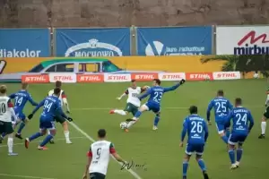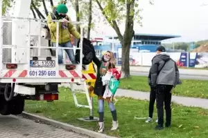 Początkowo wydawało się, że wynajęcie takiego podnośnika to szybki temat. Tylko mecz jest w niedzielę, a to dzień mało atrakcyjny do pracy. Nawet jeżeli ktoś wyraził zgodę na wynajęcie, to słysząc, że chcemy obejrzeć z niego mecz piłki nożnej, odmawiał. W końcu po dziesiątkach telefonów Tomka, trafiamy na firmę, dla której ta akcja, to atrakcja. Operator Marek, to gość z typu „damy radę”, już w rozmowach telefonicznych słyszeliśmy, że tu nie ma opcji na porażkę. Wyjeżdżamy ze Środy Śląskiej o 07.00 rano, w Płocku meldujemy się po 11.00. Na miejscu rozważamy dwie lokalizacje dla podnośnika, ostatecznie wybieramy parking przed stadionem. O 12.20 Tomasz z Martą, która zostaje chorążym, zajmują miejsca 23 metry nad ziemią. Niestety silne podmuchy wiatru zmuszają operatora do obniżenia kosza na około 18 metrów. Na szczęście padało tylko przez chwilę i w „spokoju” mogli obejrzeć mecz. Po końcowym gwizdku zwijamy sprzęt i ruszamy w drogę powrotną.