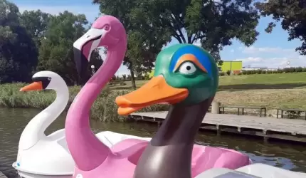 Nowy flaming i łabędź na przystani akwenu Kajaki