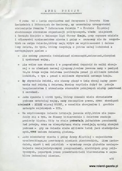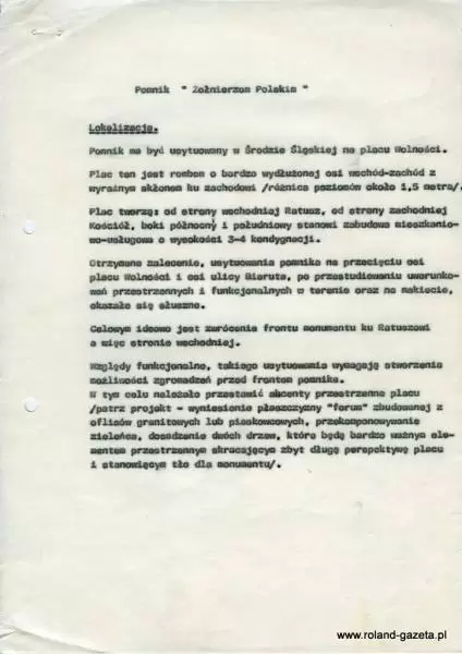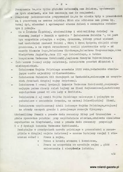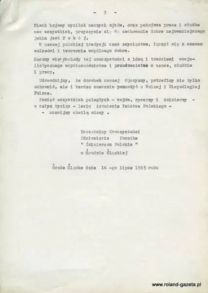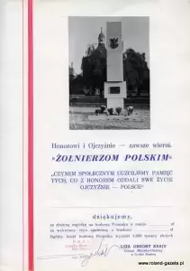 „Niechże obecne i następne pokolenia Polaków wiedzą, że w tym pomniku zawarte jest całe minione tysiąc lat Państwa Polskiego oraz życie wojów, rycerzy, żołnierzy legionistów, żołnierzy partyzantów, a także Żołnierzy Wojska Polskiego walczących o Polskę na wszystkich frontach, poległych i bestialsko pomordowanych przez okupantów z Zachodu jak i ze Wschodu.”