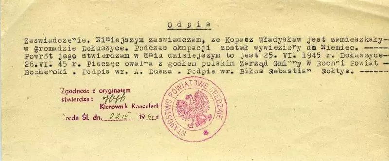 W lipcu 1945 roku Władysław Kopacz osiedla się po powrocie z niewoli niemieckiej w Środzie Śląskiej. A parę tygodni potem zaczyna pracować jako urzędnik w starostwie. I tym sposobem moja rodzina należy do najstarszych rodzin polskich - stale mieszkających w tym mieście.