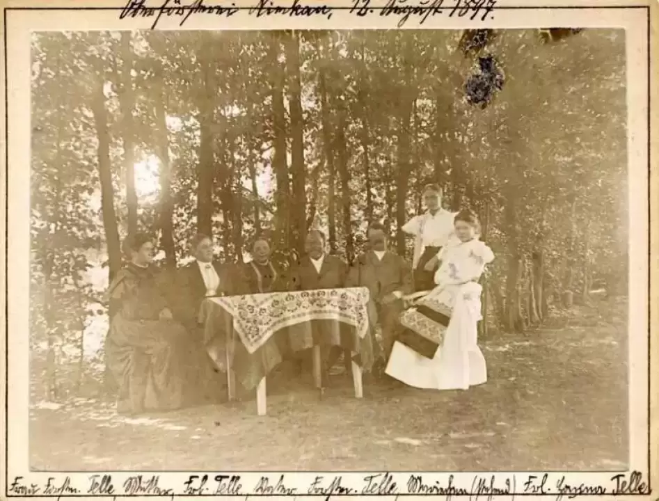 Seria trzech prezentowanych fotografii jest dokumentacją towarzyskiego spotkania, które odbyło się 12 sierpnia 1897 r. Uwieczniony na nich został ówczesny leśniczy Telle z małżonką, córką i znajomymi (krewnymi?).