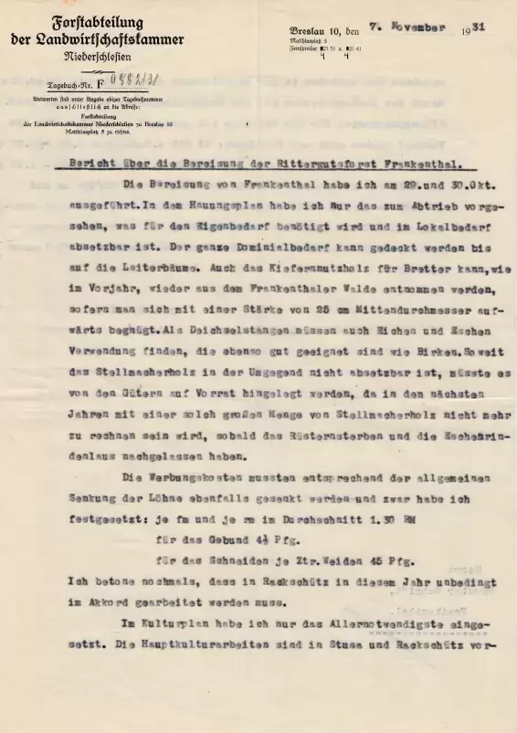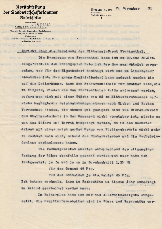 1. Sprawozdanie z wycinki lasu Frankenthal (Chwalimierz) będącego w majątku von Kramsty, str. 1