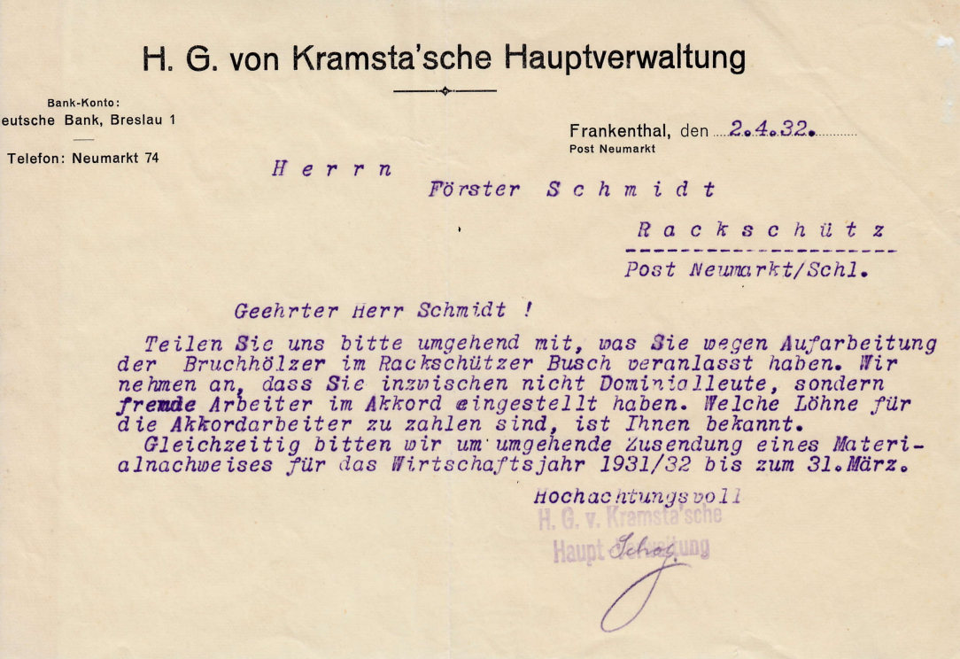 Leśniczemu Schmidtowi z Rackschutz, który był głównym leśniczym majątku von Kramsta od 1913 r. nakazano, aby ten problem rozwiązać poprzez wycinkę chorych drzew, a także zasadzenie w tych miejscach innych gatunków drzew odpornych na wspomniane choroby.
