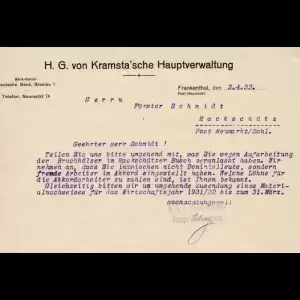 W XX w. rodzina von Kramsta była właścicielem rozległego lasu znajdującego się na południe od ich rodzimej miejscowości, czyli Chwalimierza. Na początku lat '30 XX w. las zmagał się z kornikami. Powodowały one wiele innych pośrednich problemów, dla konkretnych gatunków drzew występujących w tym konkretnym lesie. Las Frankenthal zaczął być ofiarą problemów takich jak: MSZYCA KOROWA JESIONU (osłabiała ona drzewa poprzez wysysanie soków powodując osuszanie drzew), a także GRAFIOZĘ WIĄZÓW (grzybica zamykająca kanaliki przepływowe dla soków drzewa).