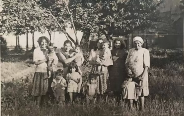 Średzcy Romowie, II połowa lat 50. ub. w. / Od prawej: w chustce Marta Siwak z siostrzenicą Marysią Siwak, Maria Ondycz, Ewa Czerwieniak, Rozalia Siwak, Helena Czerwieniak, trójka dzieci poniżej - Grażyna, Ryszard i Janusz Ondycz / fot. archiwum prywatne