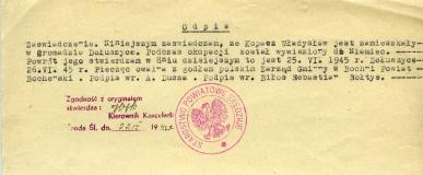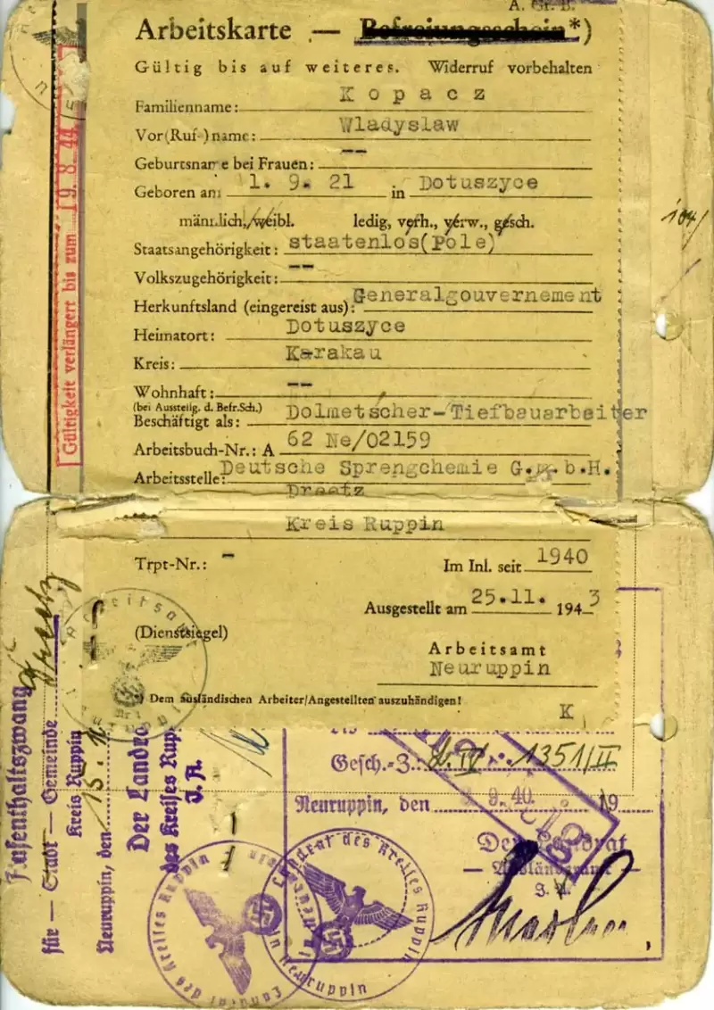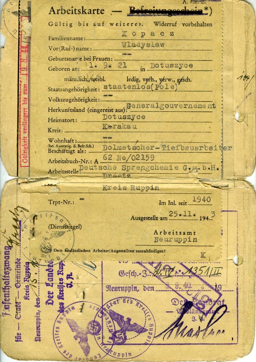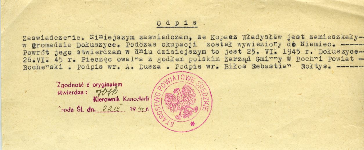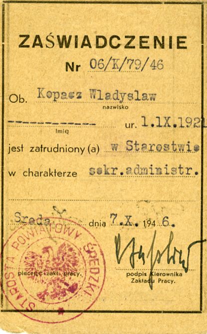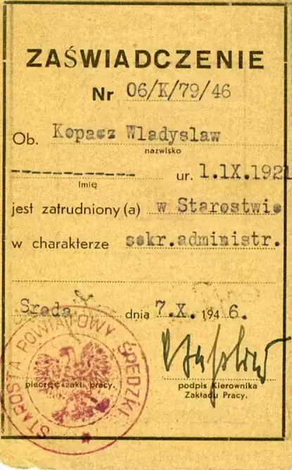 Po wieloletnim pobycie w niemieckim obozie pracy Waffenfabrik Dreetz swobodnie komunikował się z Niemcami – autochtonami w ich języku. Od nich uzyskał niezbędne informacje i materiały dotyczące sporządzenia mapy powiatu. Mapa ta wisiała w Starostwie i wielu robiło odbitki przez kalkę dla siebie. Szybko więc uległa zniszczeniu. We wrześniu 1945 r. następny starosta, Romuald Czapliński, polecił wykonać nową mapę. Po półrocznym oczekiwaniu, za wykonaną pracę Władysław Kopacz otrzymał awans i dwa litry spirytusu. Mapa służyła urzędowi parę lat.