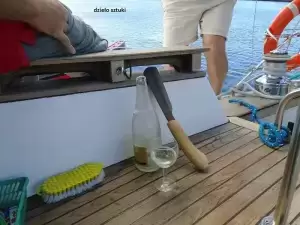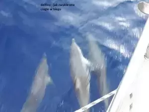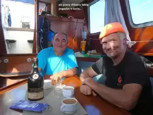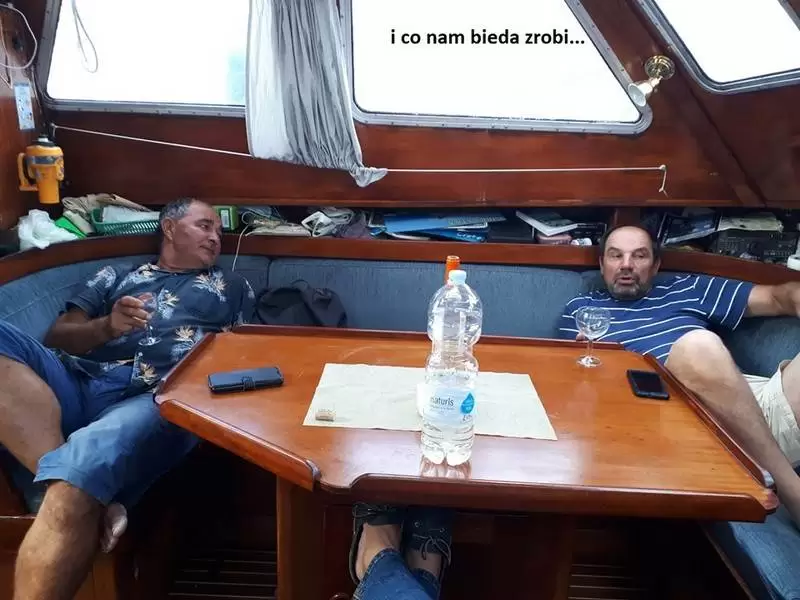 Załoga to trzech panów w wieku dojrzałym, ale jeszcze nie średnim - jeden ciągle na wydaniu. Opływanych. Nikt takich na kolejności wacht nie oszuka, jak również na ilości butelek wina w piwnicy jachtowej. Jacek wachtuje od 23 do 1 w nocy, Tadzia od 1 do 4. Wiesław od 4 do 7. I tak cały tydzień. A w dzień ten stoi na pokładzie, który nie zdążył się schować. Jacuś kucharzy, autor dba o część kulturalno - oświatową załogi – audobooki. Pozdrawiamy Kasię Bondę!!! Wiesław próbuje łapać radio Wolną Europę, aby poznać wyniki wyborów. Czasem jakieś delfiny, raz orki, a głównie statki i kutry rybackie "uprzyjemniały" nam życie. Nudy. Ryby brały słabo, a jak już wzięły to coś do pyska, to się zerwały tuż przy jachcie. Zawsze z blachą za 12 eur. Jedna spierdzieliła przez dziurę w kasarku.