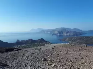 Nazajutrz ruszamy na wulkan z buta, bo inaczej nie można. Na szczycie kalder Cratere di Vulcano ostatnia wielka erupcja w 1880 roku. Spowite dymami z Fumaroli zbocze krateru robi wrażenie. Ponoć jedyny w Europie, do którego można zejść i dotknąć rękoma siarki. Temperatura czynnej aktywnie siarki wynosi 100-150 stop C. Czasem ciepło w stopy, pomimo butów. Ostry dym gryzie w płuca, ale da się po nich chodzić. Z góry widok na wyspy Eolskie niesamowity.