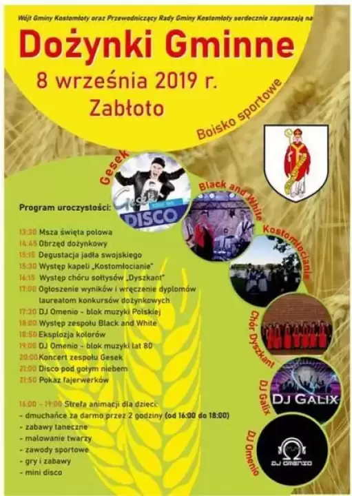 Wójt Gminy Kostomłoty oraz Przewodnicząca Rady Gminy Kostomłoty, serdecznie zapraszają na Dożynki Gminne, które odbędą się na boisku w miejscowości Zabłoto 8 września 2019 r.