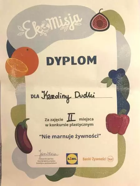 - II miejsce w ogólnopolskim konkursie Ekomisja „Nie marnuję żywności w szkole”,- organizowanym przez Federacja Polskich Banków Żywności wraz z siecią sklepów LIDL.