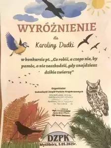 - Wyróżnienie w konkursie „Eco–zakładka” i Wyróżnienie „Jak chronić dzikie zwierzęta” organizowanym przez DZPK Oddział Myślibórz.