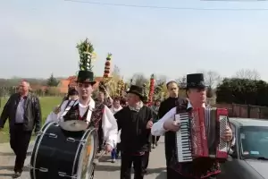 Po części sakralnej, kolorowym korowodem prowadzonym przez kapelę Kostomłocianie przemaszerowano do świetlicy wiejskiej w Piotrowicach, gdzie na uczestników święta czekały kolejne atrakcje w postaci stołów wielkanocnych pełnych dekoracji, ręcznie malowanych pisanek, szytych królików, kwiatów wiosennych i zajączków, wypiekanych baranków i inne wyroby pracy rąk ludzkich, które zasługują na wyrazy uznania i są żywym przykładem talentów lokalnej społeczności.