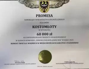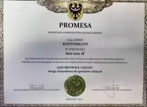 W ramach powyższych konkursów Gmina Kostomłoty otrzymała środki na przebudowę drogi dojazdowej do gruntów rolnych relacji Jakubkowice - Czechy w kwocie 600 000,00 zł oraz remont świetlic wiejskich w miejscowościach Kaczyce i Paździorno w kwocie 60 000,00 zł.