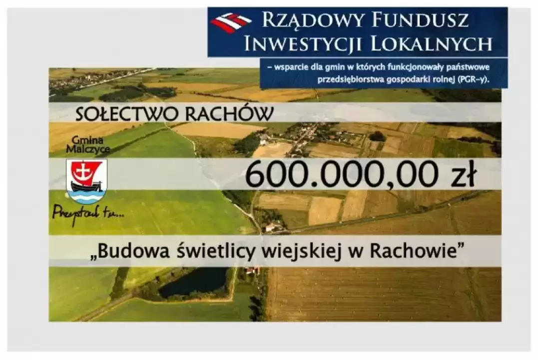 Złożony wniosek oraz skuteczne rozmowy z przedstawicielami administracji rządowej, zaowocowały przyznaną dotacją w kwocie 600.000 zł, która pozwoli na wybudowanie nowoczesnej świetlicy wiejskiej w Rachowie.
