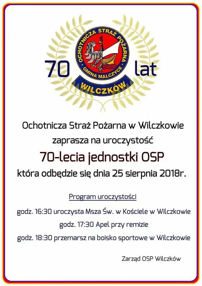 25 sierpnia strażacy z Wilczkowa organizują uroczystość z okazji powstania miejscowej jednostki Ochotniczej Straży Pożarnej.