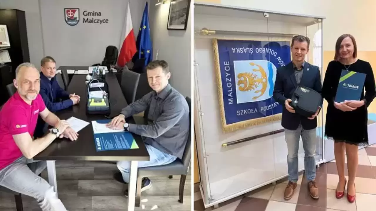 - Firma TRIAGE Sp. z o.o. zwróciła się z prośbą o umieszczenie defibrylatora AED w placówce oświatowej, który w dniu dzisiejszym przekazaliśmy na ręce Pani Dyrektor. Sprzęt medyczny analizujący rytm serca, wyłapując nieprawidłowości w pracy serca podejmuje decyzje o konieczności defibrylacji, czyli impulsie elektrycznym przywracającym prawidłowy rytm. Zadaniem AED jest unormowanie migotania komór serca. W przypadku wystąpienia nagłego zatrzymania krążenia, w połączeniu z prowadzoną resuscytacją krążeniowo – oddechową, jest jedynym sposobem na uratowanie życia - informuje Gmina Malczyce i dziękuje firmie TRIAGE Sp z o.o. - Dzięki defibrylatorowi AED, który nieodpłatnie otrzymaliśmy od Państwa w znacznym stopniu zwiększa poczucie nie tylko naszego bezpieczeństwa, ale również bezpieczeństwa całej społeczności lokalnej.