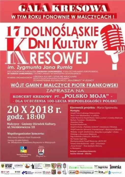 W imieniu organizatorów, wójt gminy Malczyce Piotr Frankowski zaprasza na Koncert Kresowy Pt. „Polsko Moja”, dla uczczenia 100-lecia Niepodległości Polski.