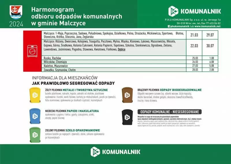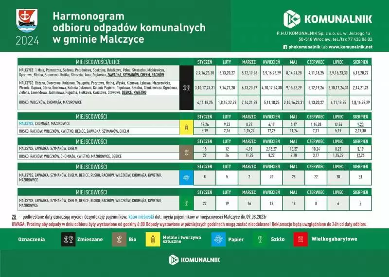Harmonogram odbioru odpadów z terenu Gminy Malczyce na rok 2024