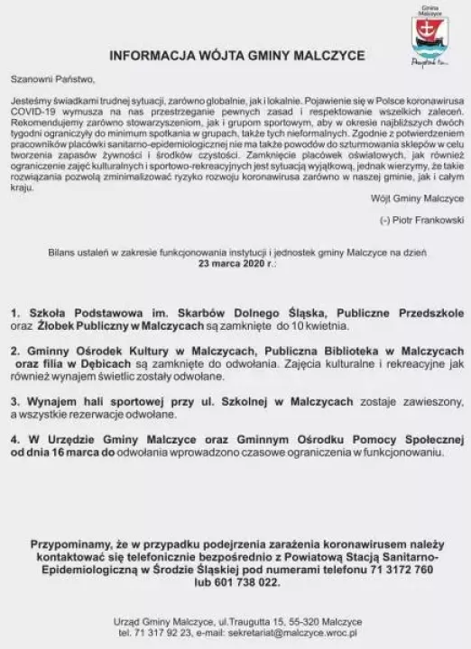 Przedstawiamy bilans ustaleń w zakresie funkcjonowania instytucji i jednostek gminy Malczyce na dzień 23 marca 2020 r.