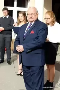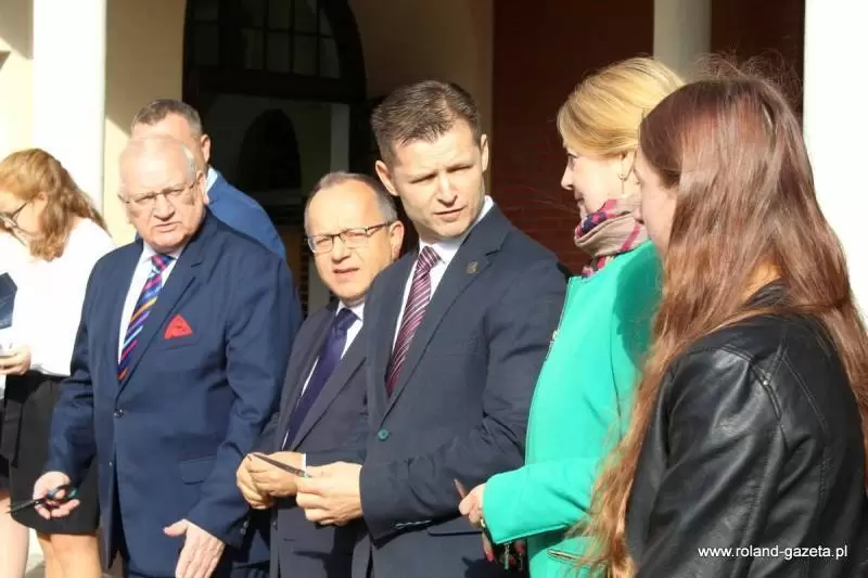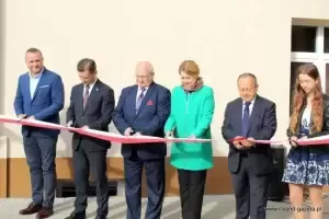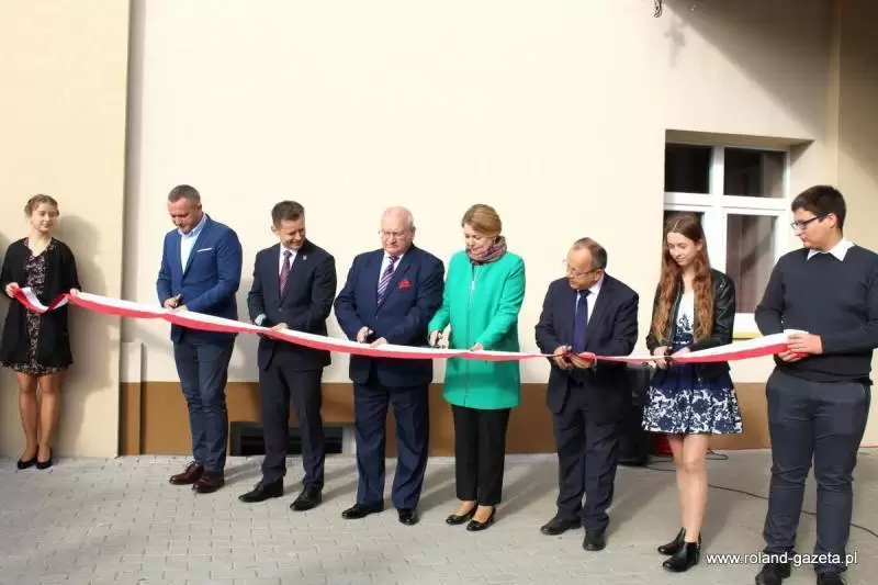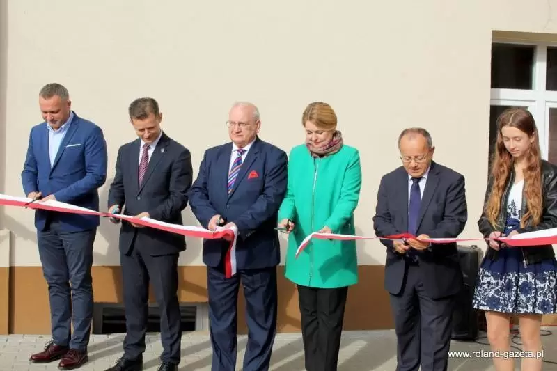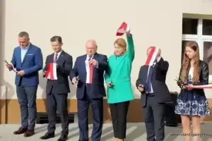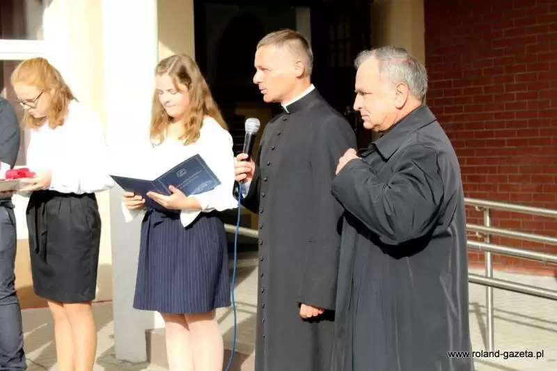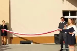 Uroczystość rozpoczęto przed budynkiem szkolnym, gdzie przecięto symboliczną wstęgę oraz poświęcono budynek, wraz z tablicą.