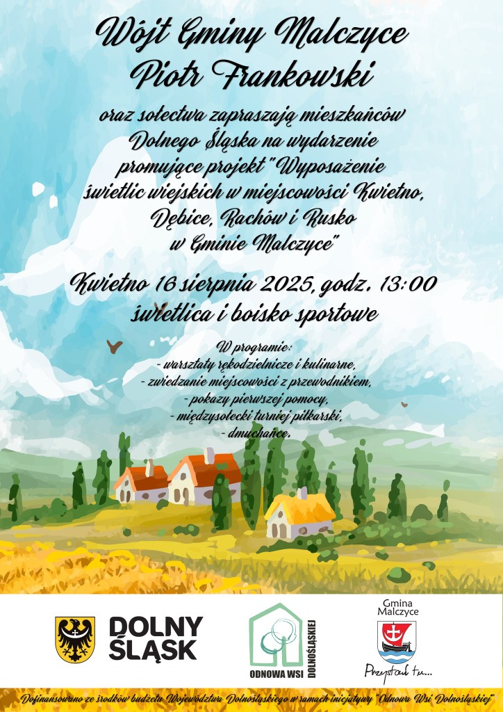 16 sierpnia 2025 r. w Kwietnie, w ramach promocji wydarzenia pn. Wyposażenie świetlic wiejskich w miejscowości Kwietno, Dębice, Rachów i Rusko w Gminie Malczyce, realizowanego w ramach konkursu ,,Odnowa Dolnośląskiej Wsi” finansowanego z budżetu Województwa Dolnośląskiego, przygotowano wiele atrakcji dla mieszkańców i gości w różnym wieku.