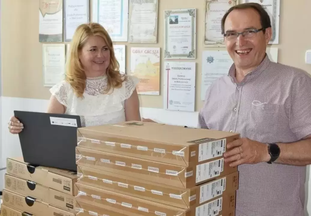 Szkolny sprzęt komputerowy, który ma wspomagać zdalne nauczanie powiększył się o kolejnych 15 nowych komputerów przenośnych. Zostały one przekazane dyrektorowi szkoły Marzenie Łaziuk.