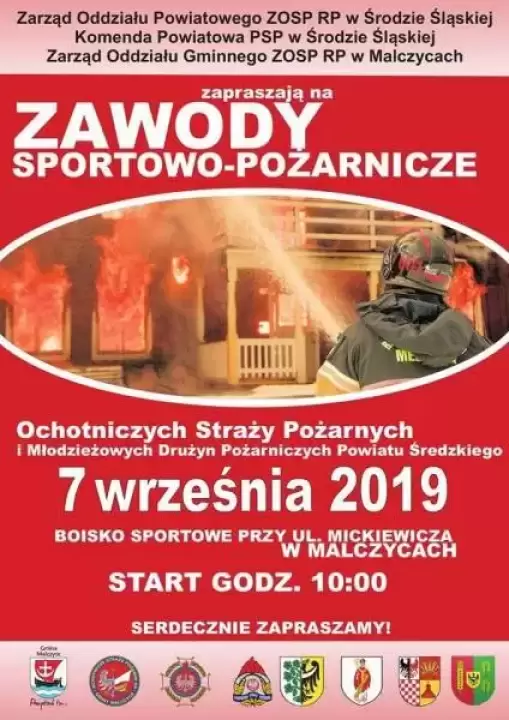 Zarząd Oddziału Powiatowego ZOSP RP w Środzie Śląskiej, Komenda Powiatowa PSP w Środzie Śląskiej oraz Zarząd Oddziału Gminnego ZOSP RP w Malczycach, zapraszają na Zawody Sportowo – Pożarnicze Ochotniczych Straży Pożarnych i Młodzieżowych Drużyn Pożarniczych Powiatu Średzkiego.