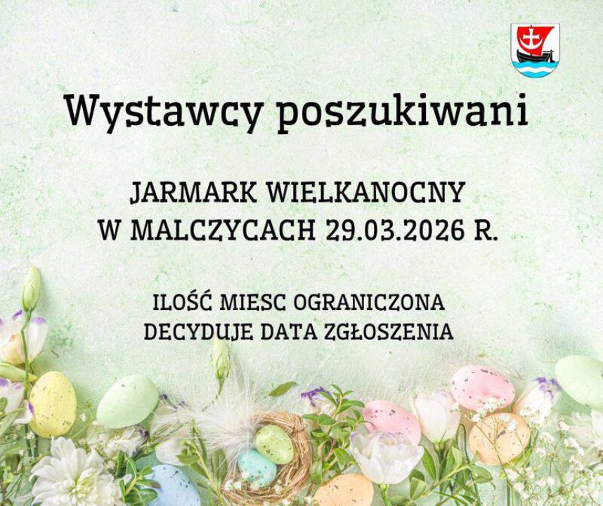 Zapraszamy wszystkich zainteresowanych wystawców do zgłaszania chęci udziału w Jarmarku Wielkanocnym, który odbędzie się w Niedzielę Palmową 29.03.2026 r. na terenie przy kościele pw. Niepokalanego Poczęcia NMP w Malczycach. Czas trwania od 8.00 do 14.00.
