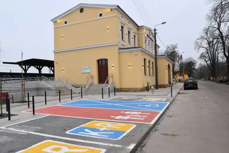 Metamorfozę przeszło bezpośrednie otoczenie dworca. Po wschodniej stronie budynku powstał mini plac dworcowy z na nowo zaaranżowaną zielenią, małą architekturą (ławki, kosze, oświetlenie) oraz miejscami postojowymi dla osób z niepełnosprawnościami, rodzin z dziećmi oraz typu kiss&ride. Natomiast przy zachodniej elewacji parking dla samochodów oraz wiata rowerowa ze stojakami dla jednośladów.