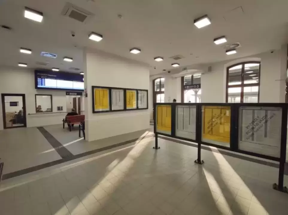 Przebudowana została również przestrzeń wewnątrz dworca, która została dostosowana do współczesnych standardów obsługi podróżnych. Na parterze zlokalizowano hol pełniący funkcję poczekalni, pomieszczenie dla rodziców z dziećmi, toalety, a także posterunek Rewiru Dzielnicowych Policji. Natomiast na piętrze budynku będzie mieścić się biblioteka publiczna prowadzona przez samorząd lokalny. W przestrzeni związanej z obsługą podróżnych zainstalowano elektroniczne tablice odjazdów i przyjazdów pociągu, a także system informacji głosowej.