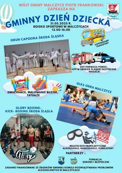 Zapraszamy 31 maja na Gminny Dzień Dziecka na boisko sportowe przy ul. Mickiewicza w Malczycach. Czeka na was moc atrakcji.