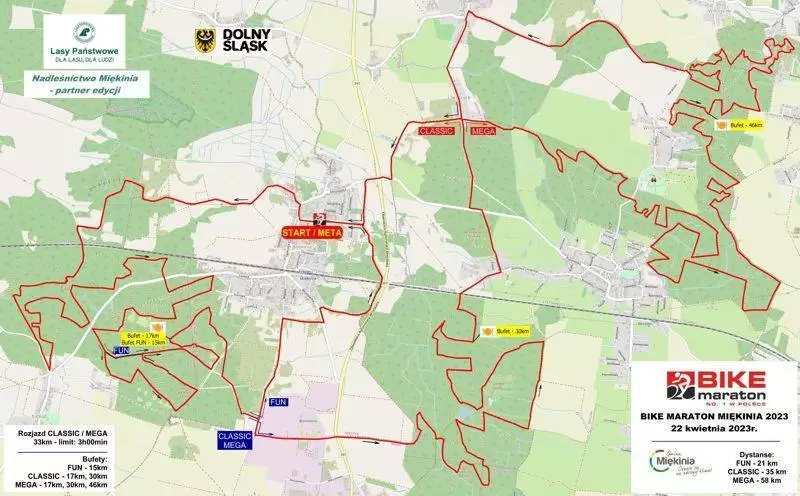 Po tegorocznych zmianach w regulaminie Bike Maratonu, mamy w cyklu trzy dystanse: FUN, CLASSIC i MEGA. Będzie też w Miękini odrębna klasyfikacja dla rowerów elektrycznych i wyścigi dla dzieci PKO Ubezpieczenia Junior Race. Odrębną klasyfikacją będą też 1. Mistrzostwa Dolnośląskiej Okręgowej Izby Inżynierów Budownictwa.