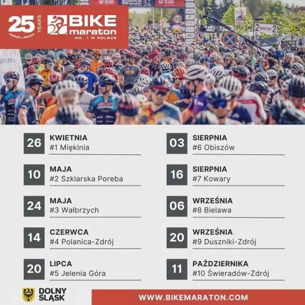 Bike Maraton 2025 zaczynamy w Miękini, a tegoroczną podróż przez Dolny Śląsk zakończymy 11 października w Świeradowie-Zdroju. W związku z obchodami okrągłych urodzin organizatorzy planują oczywiście szereg niespodzianek, rozłożonych w czasie na cały, długi sezon.