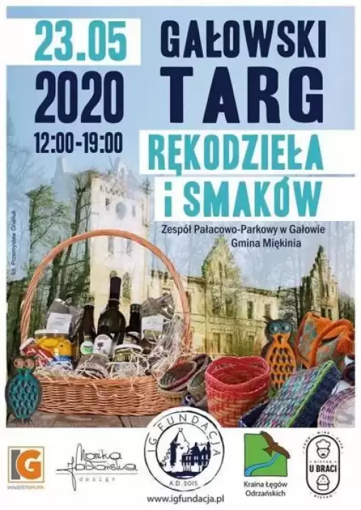 23 maja 2020 r. w godzinach od 12:00-19:00 na terenie Zespołu Pałacowo – Parkowego w Gałowie w gminie Miękinia odbędzie się Targowisko Rękodzieła i Smaków. Oczywiście ze względu na panującą sytuację epidemiczną wymagane jest przestrzeganie środków ochrony sanitarnej i bezpieczeństwa zdrowotnego.