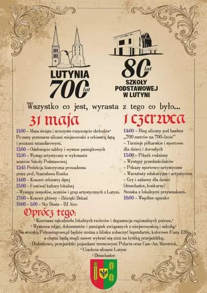 Już 31 maja i 1 czerwca czeka nas wyjątkowy weekend pełen atrakcji z okazji 700-lecia miejscowości Lutynia i 80-lecia Szkoły Podstawowej w Lutyni.
