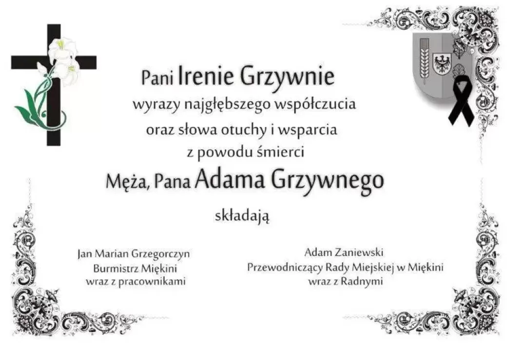 ani Irenie Grzywnie najszczersze kondolencje składają - Burmistrz Miękini Jan Marian Grzegorczyn i Przewodniczący Rady Miejskiej w Adam Zaniewski.