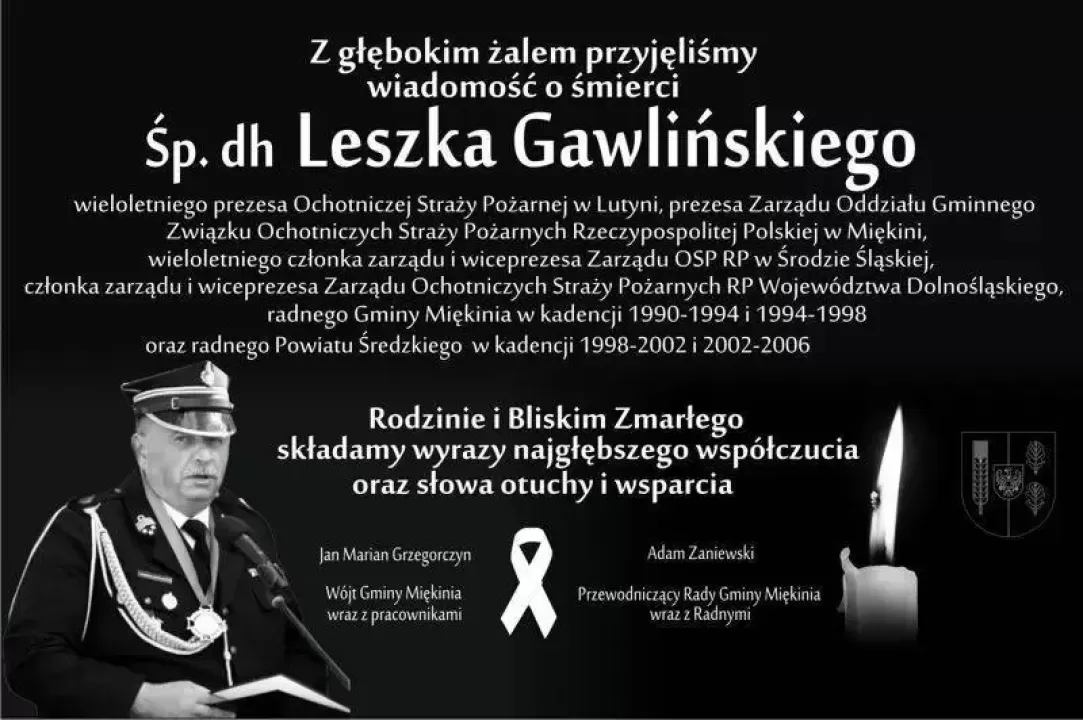 Wójt Gminy Miękinia Jan Marian Grzegorczyn wraz z pracownikami oraz Przewodniczący Rady Gminy Miękinia Adam Zaniewski wraz z Radnymi, Rodzinie i Bliskim śp. dh Leszka Gawlińskiego składają wyrazy najgłębszego współczucia oraz słowa otuchy i wsparcia.